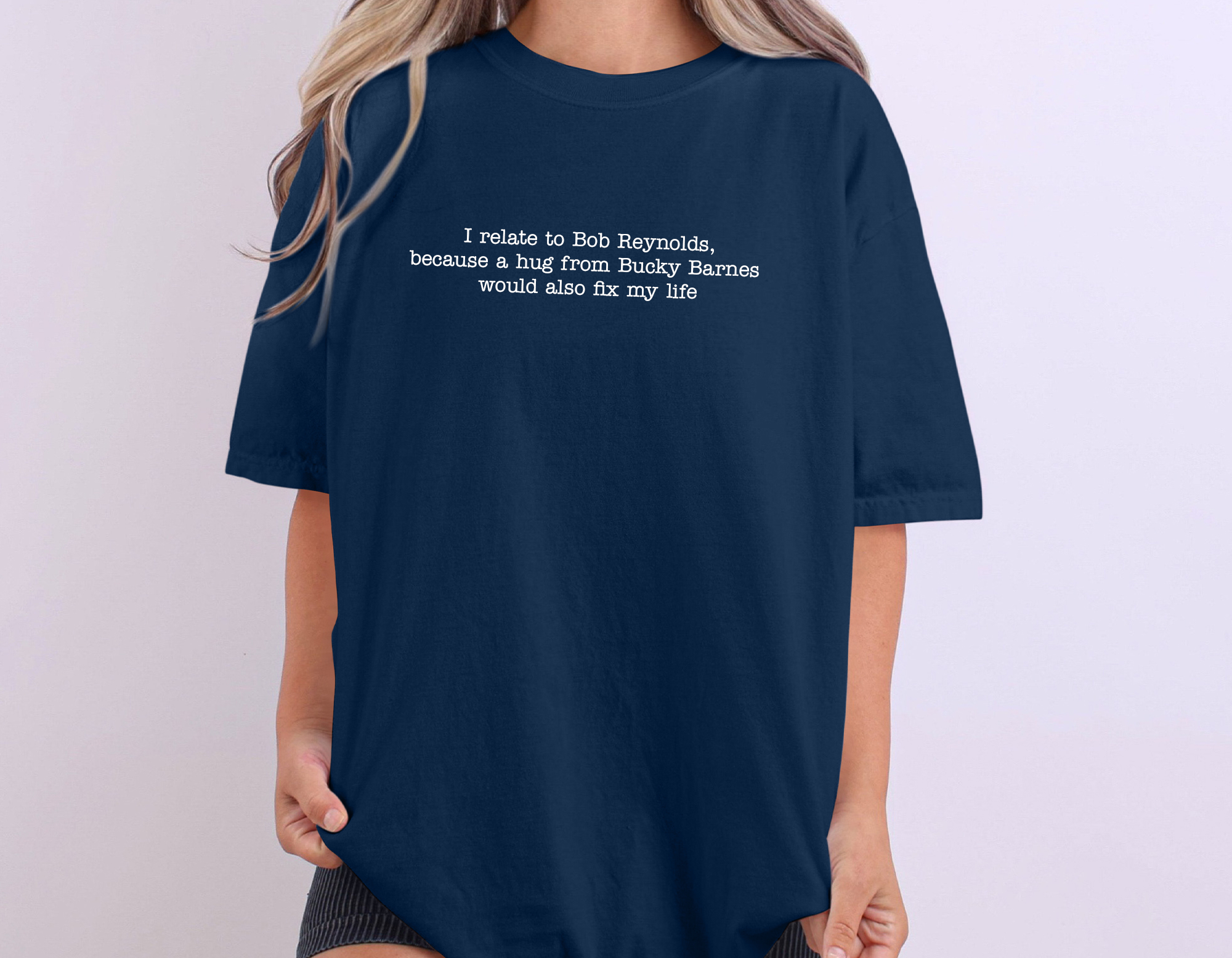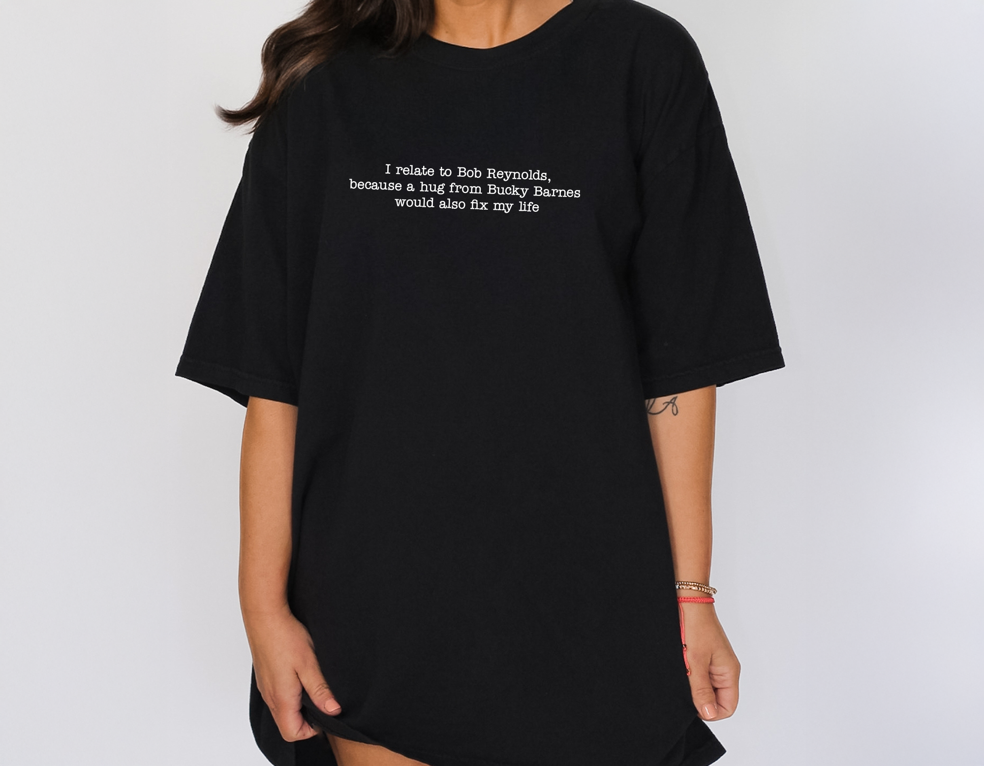 Wrap yourself in cozy comfort and Marvel humor with this statement sweatshirt. Featuring the bold text: “I relate to Bob Reynolds because a hug from Bucky Barnes would also fix my life”, this piece is perfect for anyone who knows the healing power of superheroes (and soft hoodies).